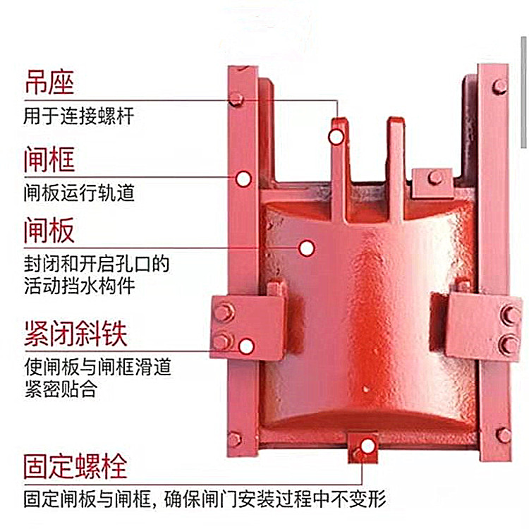 鑄鐵閘門的止水副采用整體加工,止水效果好,金屬止水使用壽命長。