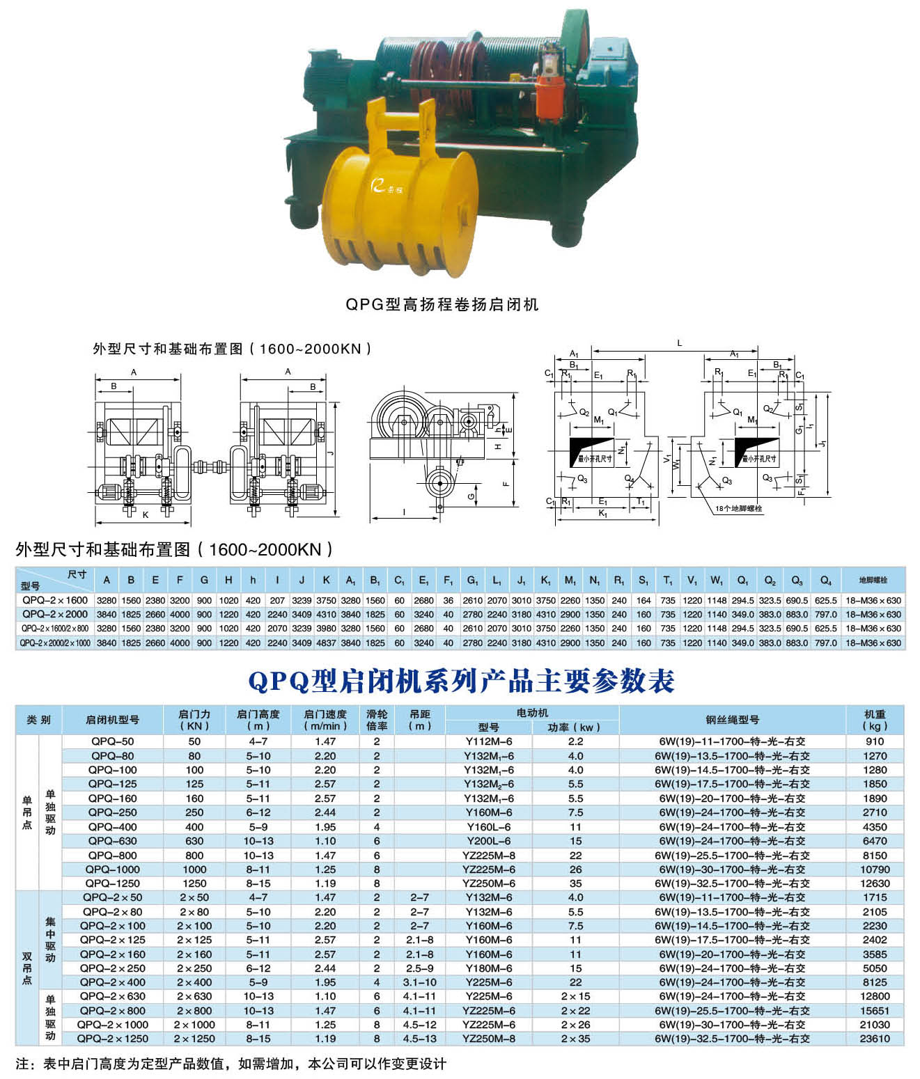 新河縣榮程水利機械廠卷揚啟閉機有多種型號:可以分為QPQ型普通卷揚啟閉機、QPK型快速卷揚啟閉機、QPG型高揚程卷揚啟閉機、QPT型臺車式卷揚啟閉機,QPM型門式卷揚啟閉機,QH型弧門卷揚啟閉機。卷揚啟閉機又分為:平門卷揚式啟閉機;弧形門卷揚式啟閉機;雙吊點卷揚式啟閉機;快速卷揚式啟閉機;移動式臺車啟閉機;雙吊點卷揚式啟閉機分為:集中驅動和單獨驅動兩種;卷揚式啟閉機手搖、電動兩用式規格分為:5噸、8噸、12噸、16噸、25噸;電動式規格分為:40噸、63噸、80噸、100噸、125噸、160噸、200噸,可以根據用戶要求設計,并能生產雙吊點卷揚式啟閉機,該機是一種水利工程專用機械,廣泛用于水利工程閘門的啟閉,是農田灌溉、水產養殖、農業經濟開發區、污水處理廠、水利發電站、水庫(水閘、堤壩、隧道、管 道)等進水、退水閘的配套機械,山區、平原有、無電地區均可使用。