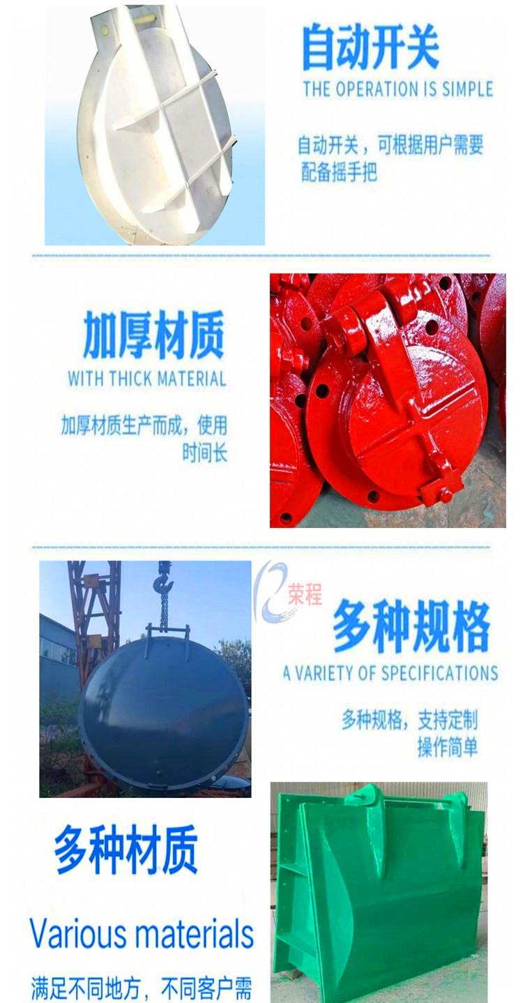 材質分為不銹鋼、鑄鐵、型鋼、復合材料(玻璃鋼)等多種材料,拍門又分為很多種,比如,浮箱式拍門,平板式拍門,套筒式拍門側翻拍門等等,可以做成懸掛式,單開門,雙開門,節能型根據客戶需要鑄造合適材質拍門,業務咨詢13582492022孫經理,微信同號。